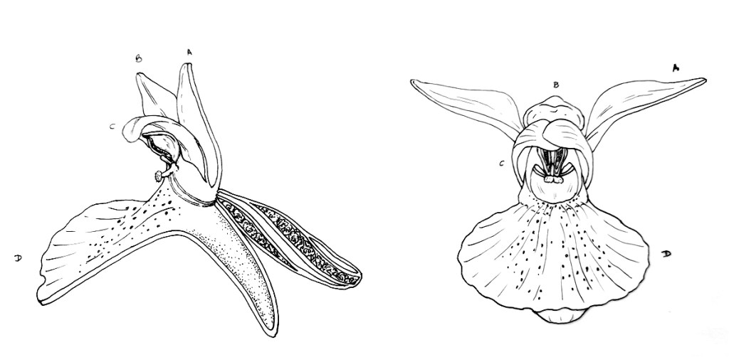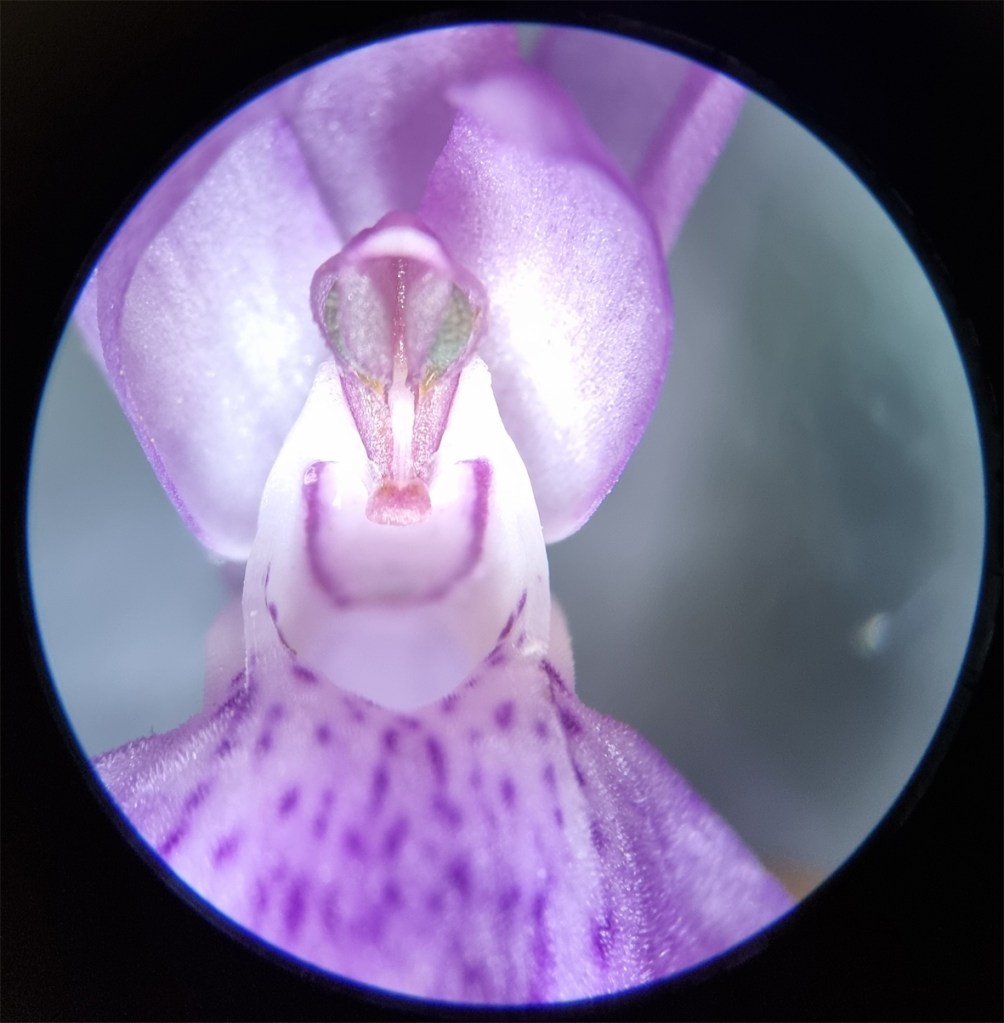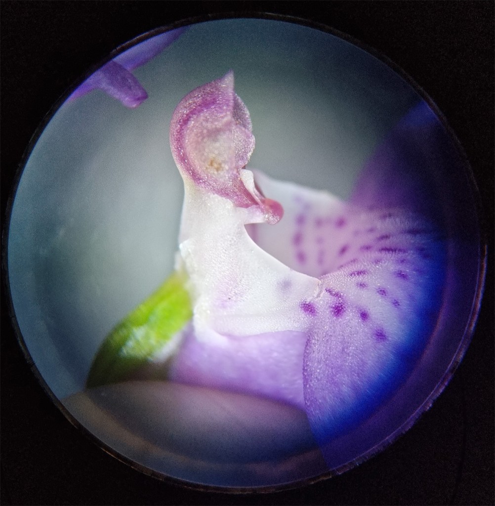 I was allowed to take a few individual flowers from an inflorescence to help me with my dissection illustrations. Orchids are difficult to dissect and understand but with the help of a botanist friend, I managed to make a perfect dissection drawing. I also painted an enlarged pollinium; a body of pollen grains forming a mass and attached to a sticky pad. There are two of them per flower on this plant. This reproductive part attaches to an insects head as it enters the flower. It is then taken by the insect to another orchid flower or plant and pollination happens. To see all the detail of these flowers I used a microscope. The front-facing orchid flower reminded me of an alien face and the side view of a baby in a bonnet! Below are images of my studies and microscope photos.