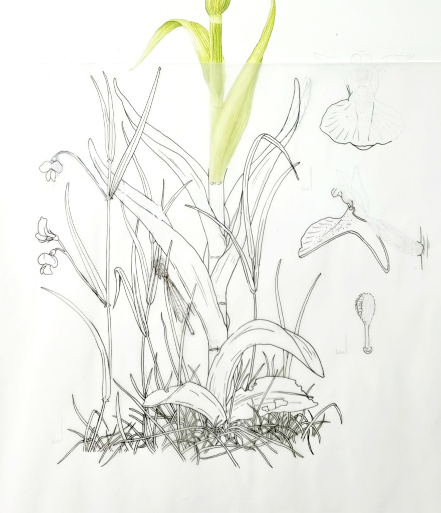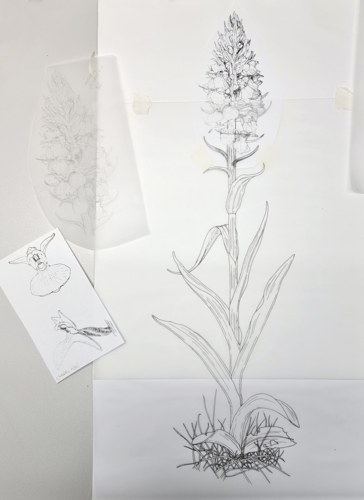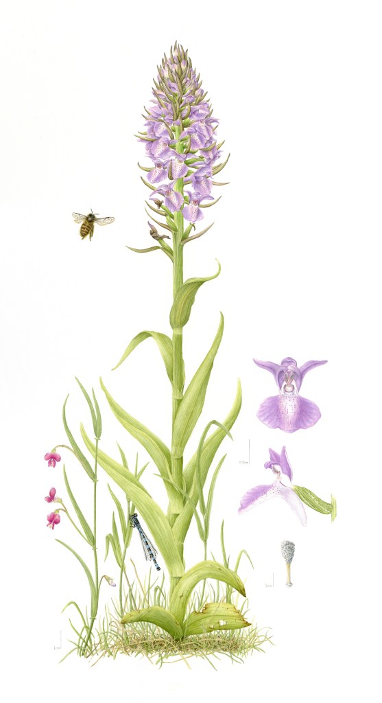 I like to find wild plants in their own habitat to make an accurate drawing and study the plant botany first. Working in this way allows you to understand everything about the plant before you start to draw. If I am able to, I will pull a plant apart and examine each individual bit before I start my composition. I make study drawings of all these parts and note measurements too. With a head full of information and notes I will start to plan out the composition. For this wild orchid, I wanted to show part of its living habitat too, which is why I included some grasses and insects in the composition. These were Grass Vetchling – growing nearby, a common blue damselfly – an insect flying around in the area and a solitary mason bee – a bee which pollinates early flowering wildflowers. I feel by including these details the plant and its story are being told.