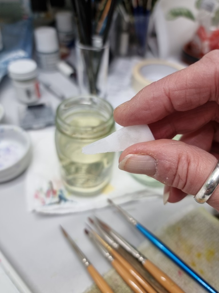 Dab with kitchen roll. The brush will have loosened the surface paint so dab it off. Don’t forget to clean the brush before doing more erasing!