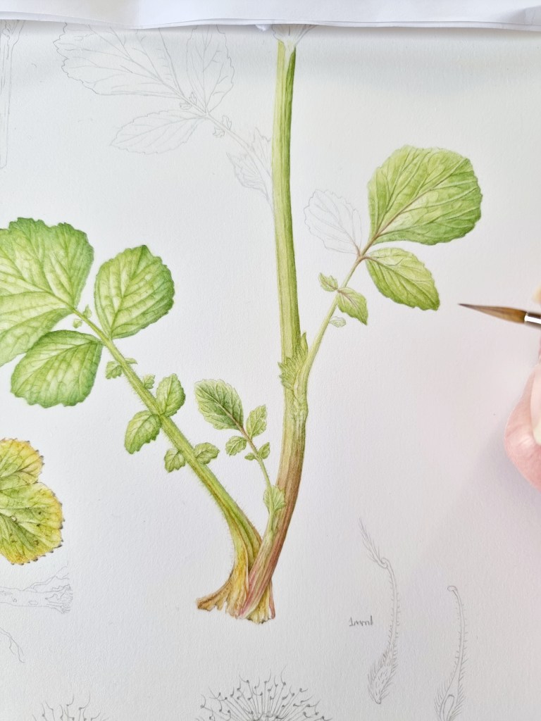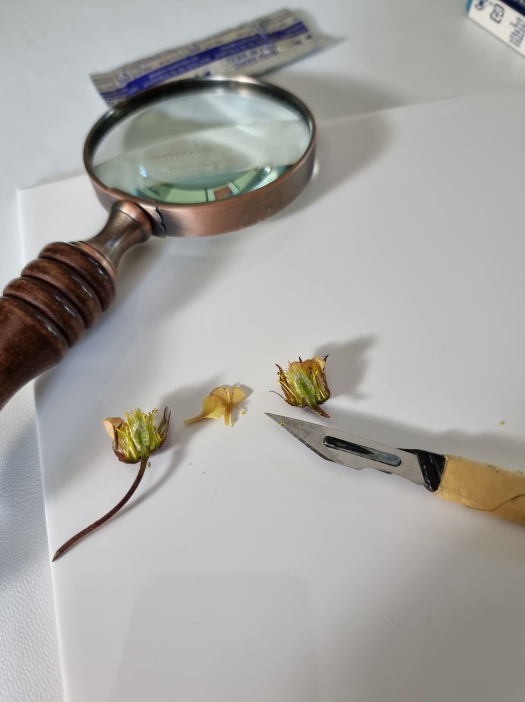 I went back to the nature reserve later on to see the seeding inflorescences. I did this so that if I had time to include this plant in my RHS entry, I would have more information available about its lifecycle. It would be a different style composition to this painting here as I have done my RHS paintings in a more scientific way. I do now have all the necessary information and research to hand though, just in case! The seeds are very small, fine and delicate, almost like dust. see microscope image below.