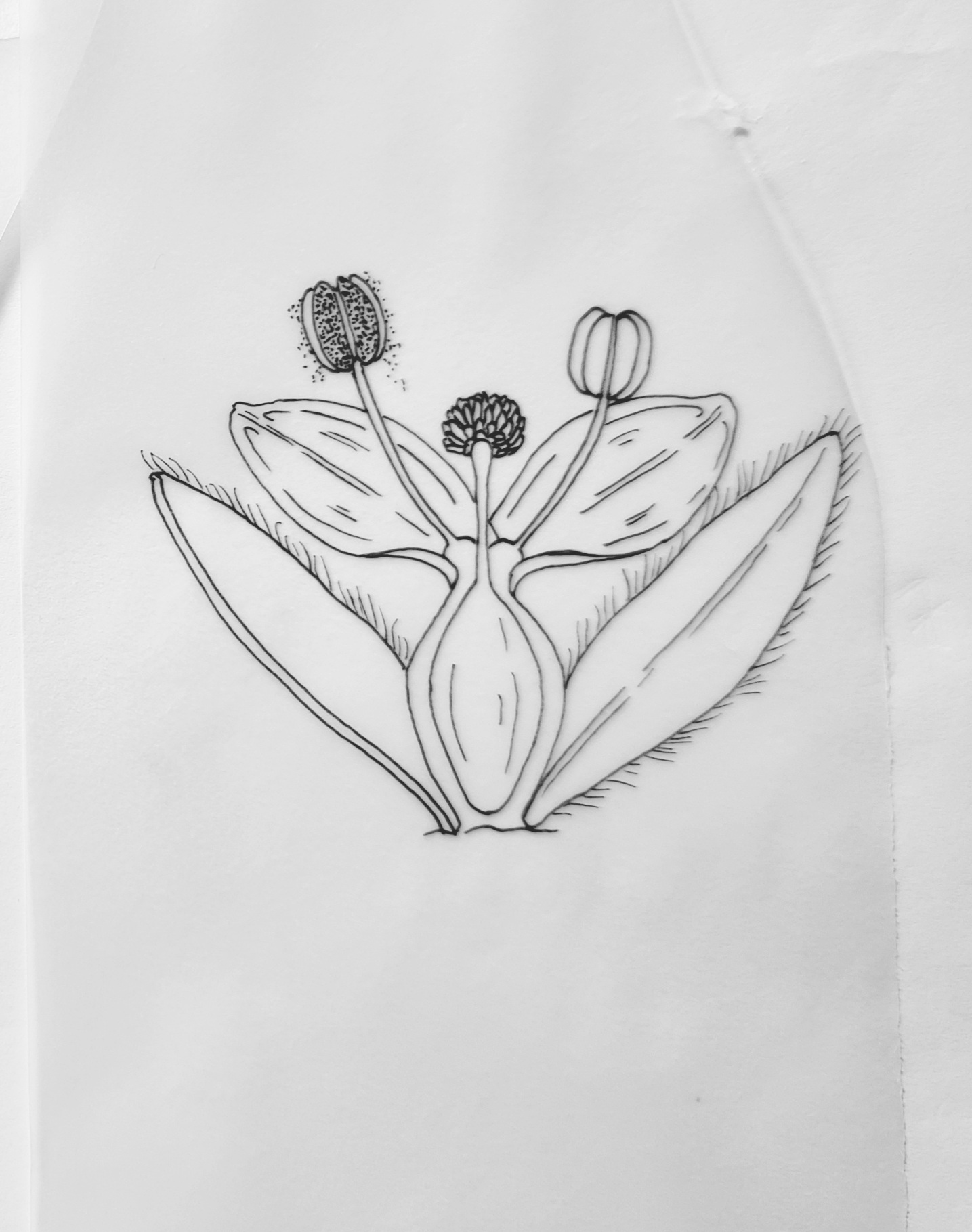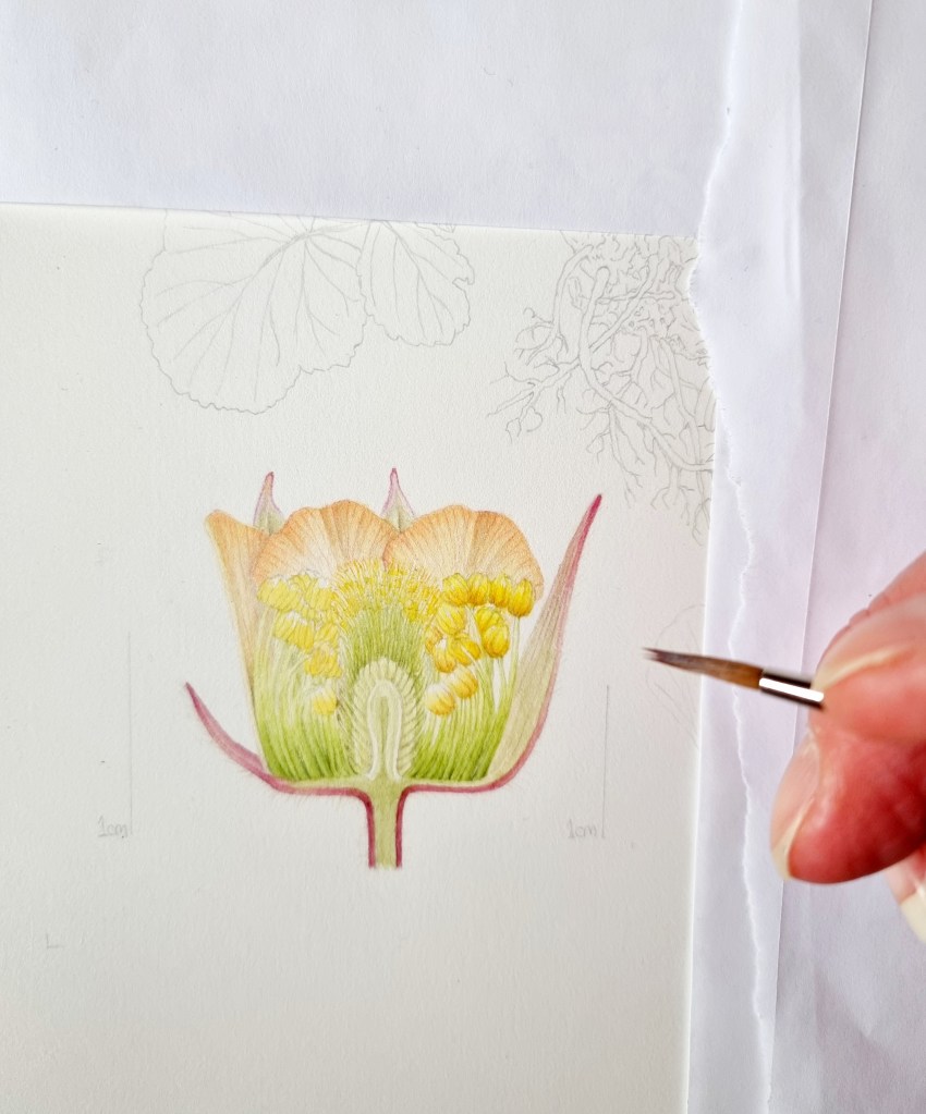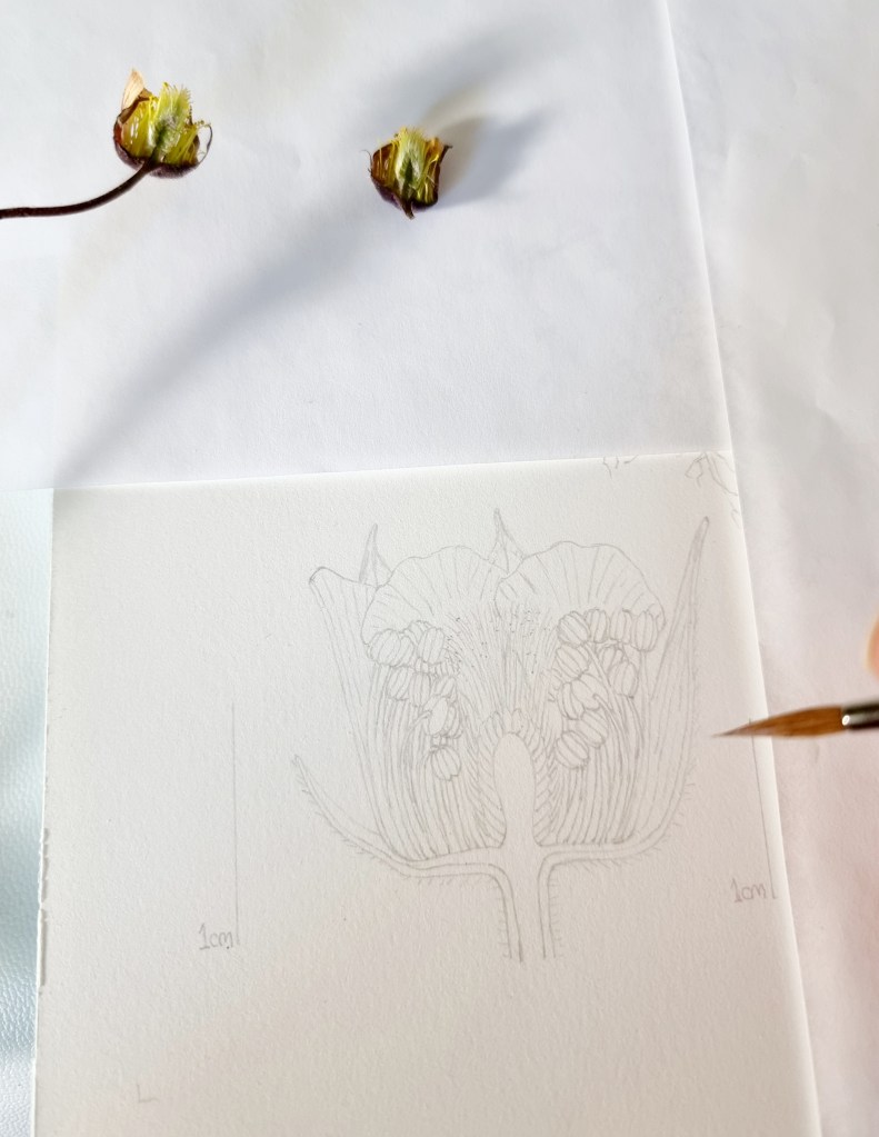 My original inflorescence sketch was too large so I outlined it in black fine liner and reduced it on my laptop, then printed it out at the correct size. It was tidied up later and drawn neatly before I transferred it to watercolour paper.
