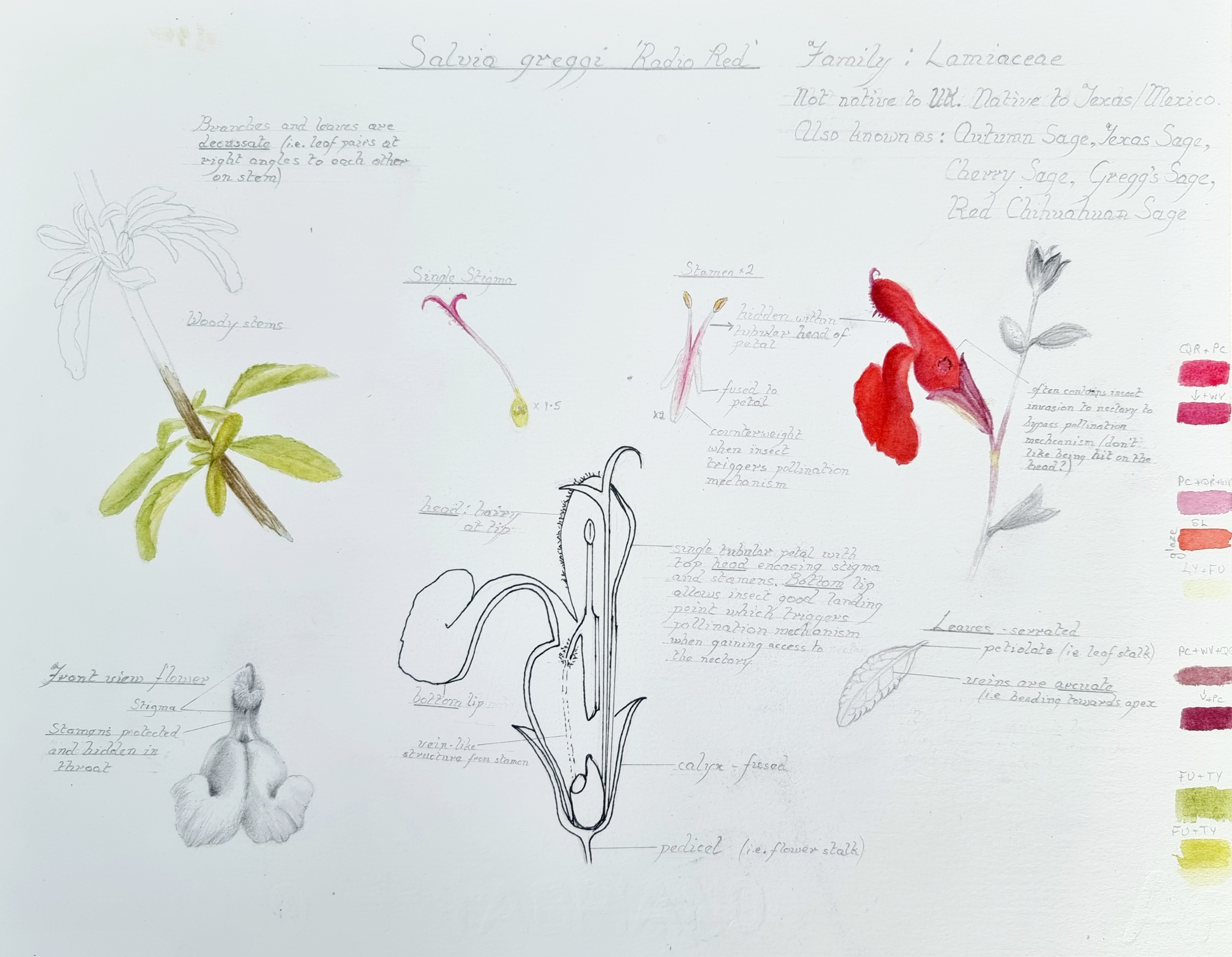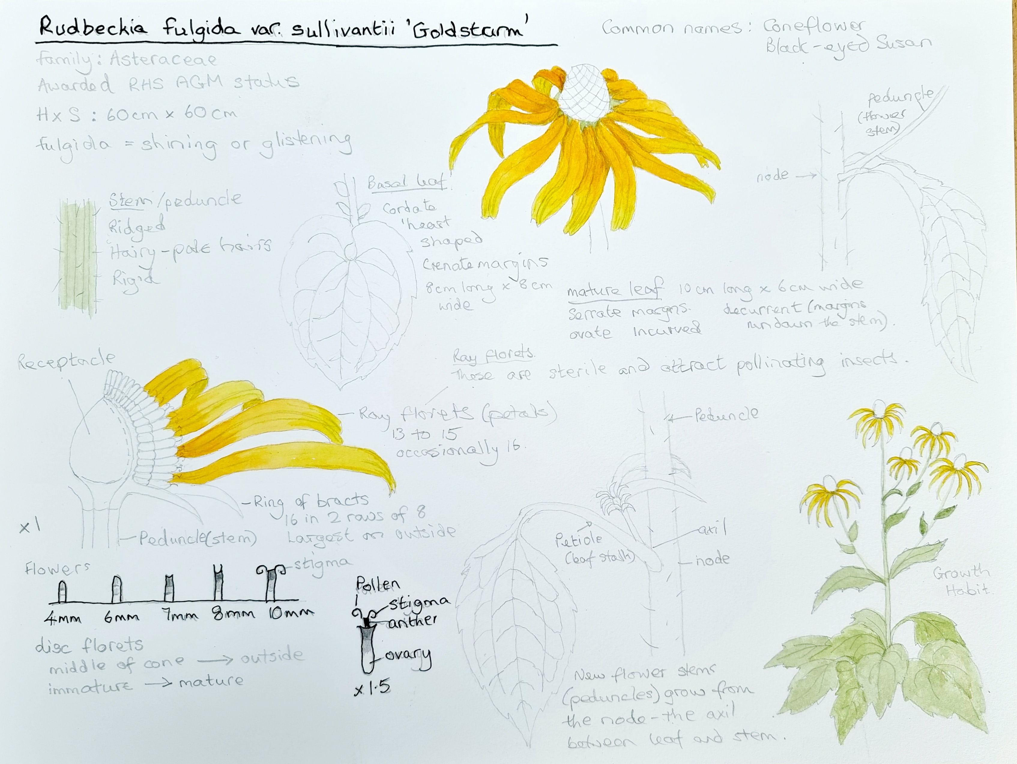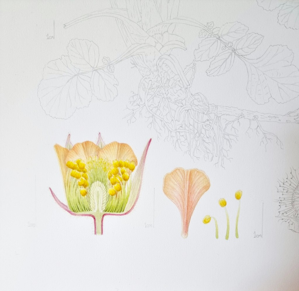 My original inflorescence sketch was too large so I outlined it in black fine liner and reduced it on my laptop, then printed it out at the correct size. It was tidied up later and drawn neatly before I transferred it to watercolour paper.