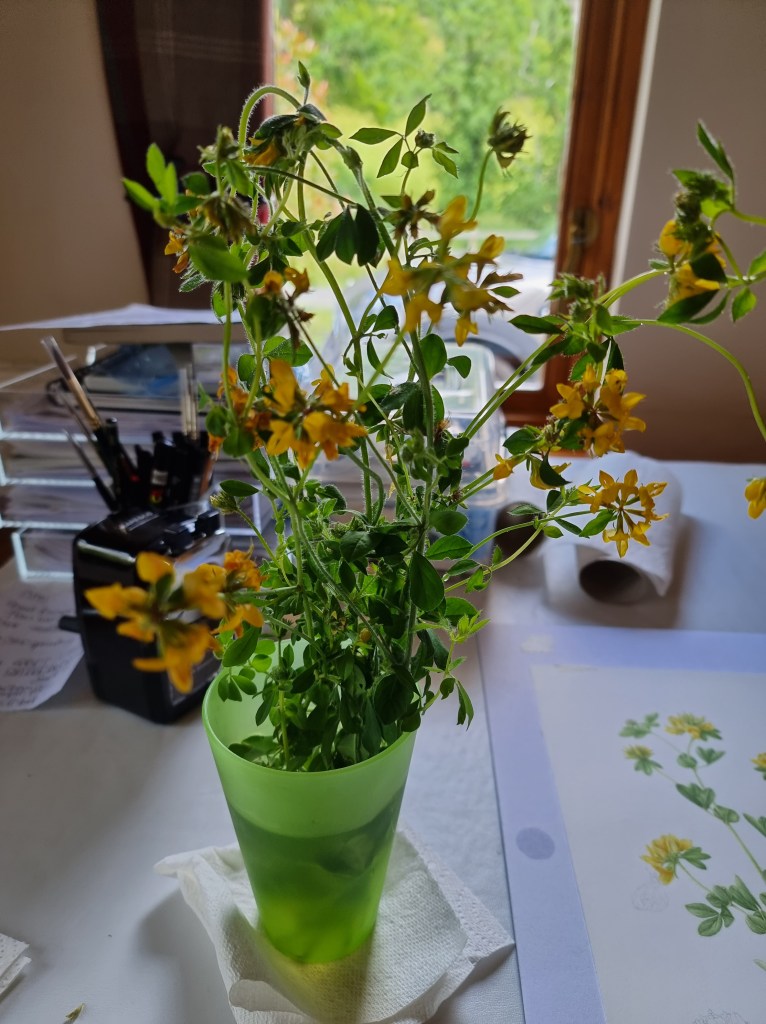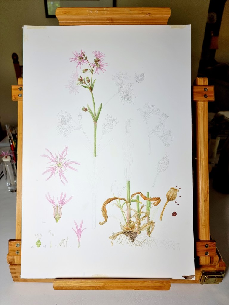 I was having great trouble locating this orchid locally when the University Bristol Botanic Garden called me one day to say they thought they had a specimen growing that I could borrow. I was delighted! Having a specimen right next to you on your desk is such a benefit when drawing and painting. However, the specimen was not a true Southern Marsh Orchid but a very similar hybrid and so my hunt went on. I have a lot of experience in hunting down wildflower species as I have had to do this for all the plants which feature in my RHS (Royal Horticultural Society) botanical exhibition work. It isn’t easy sometimes and involves a lot of research, driving around and walking!