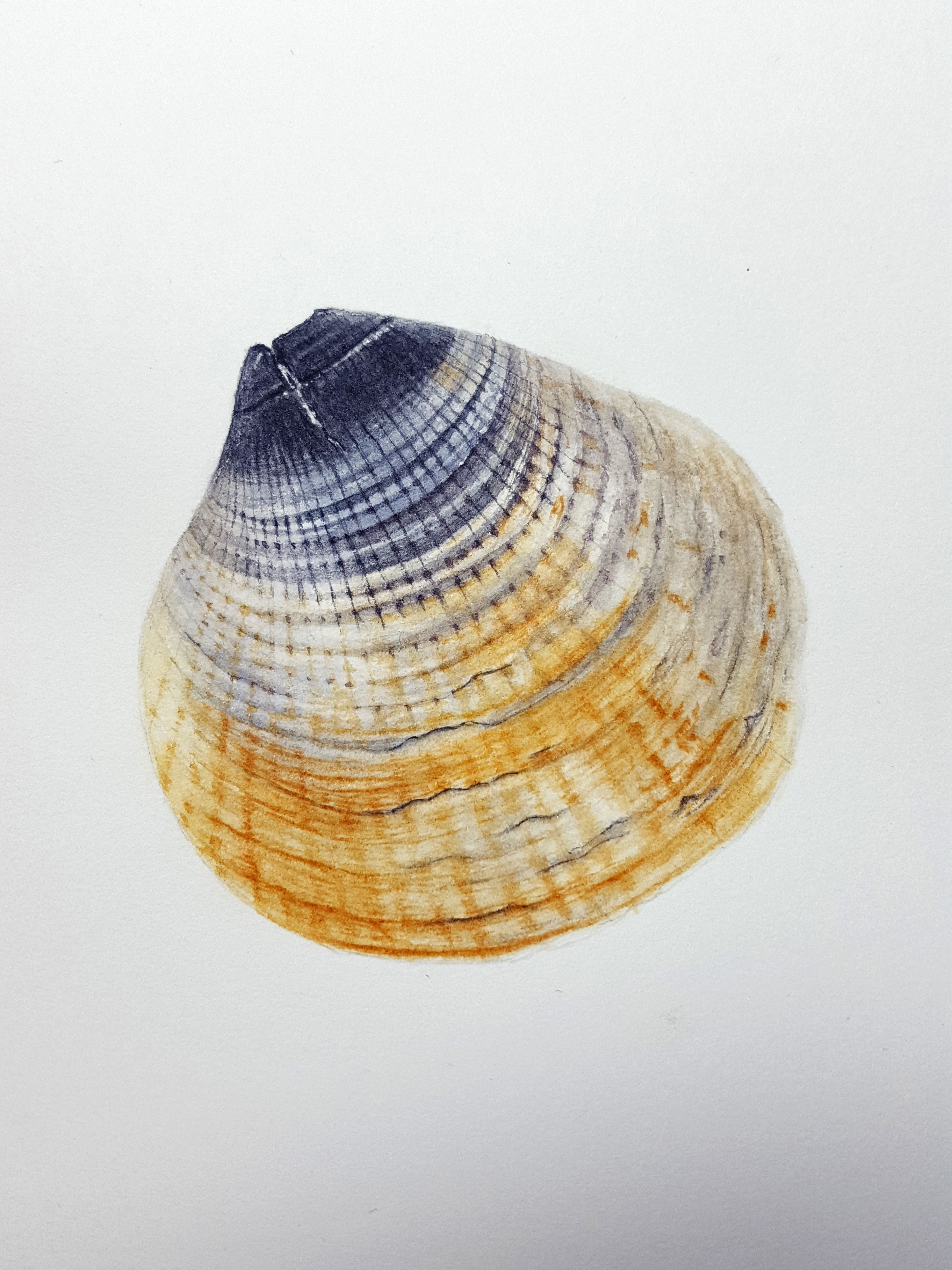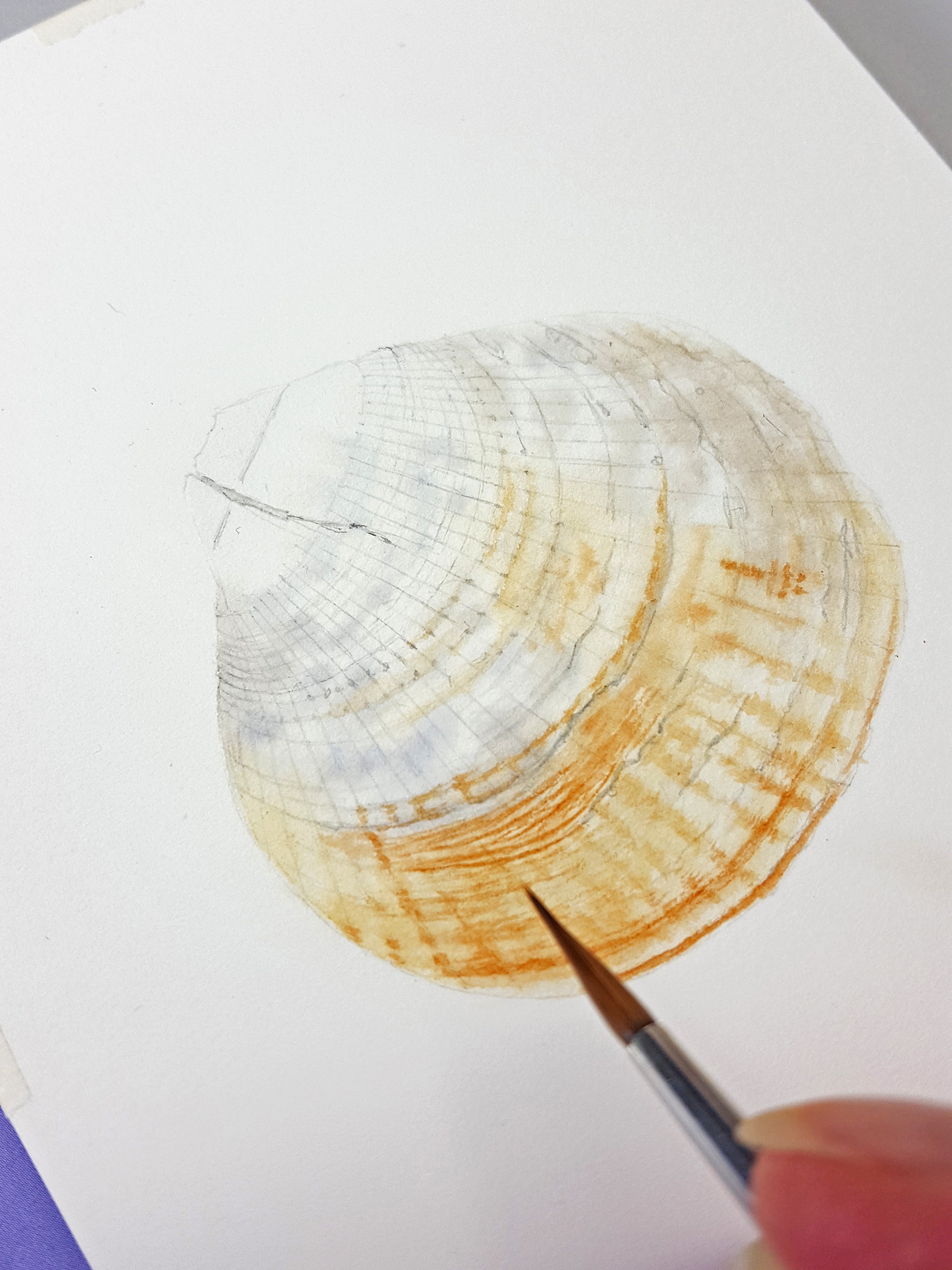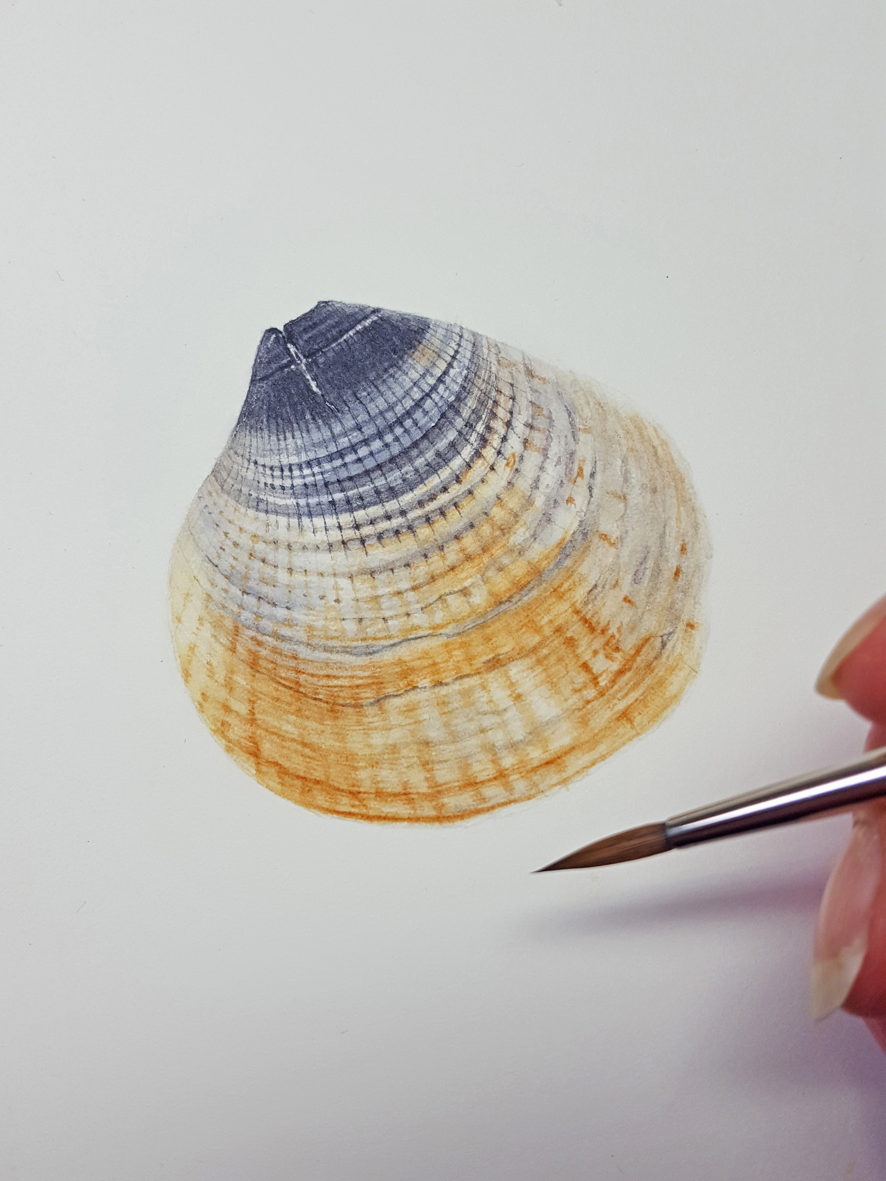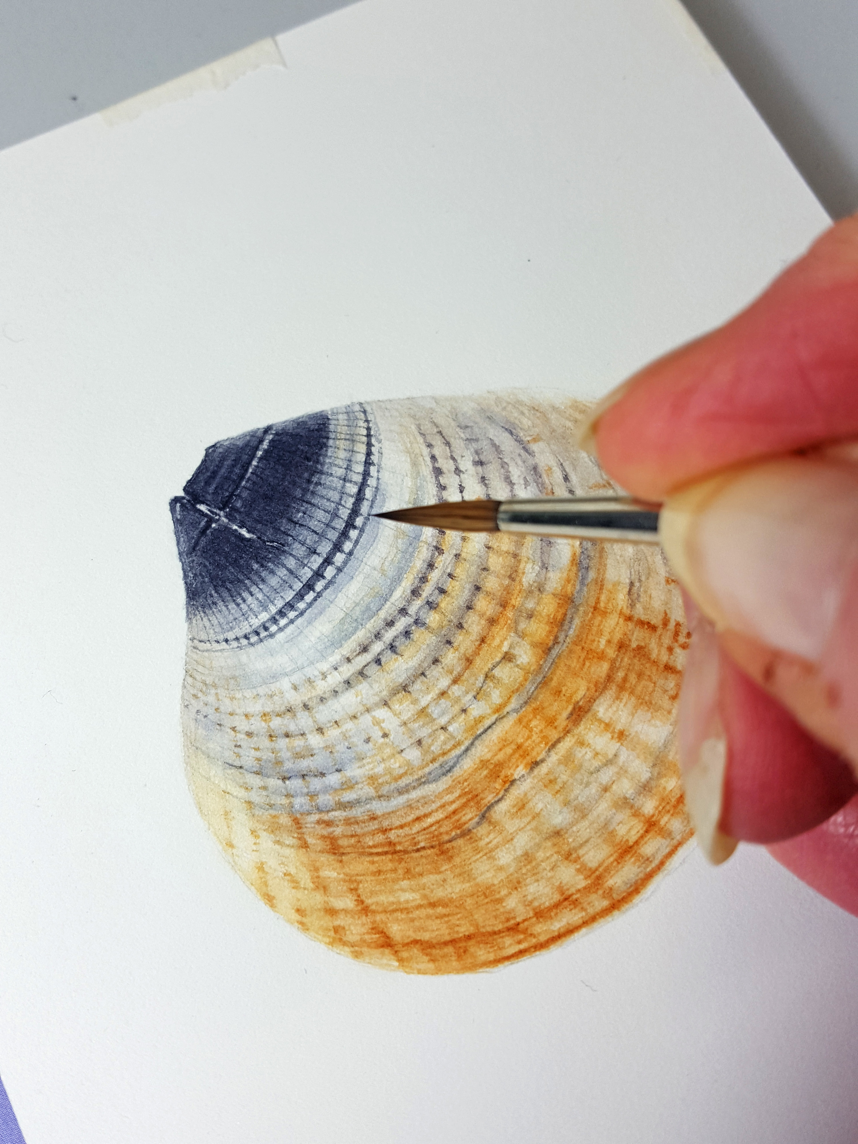 After this, I added in more of the background colours to give my shell some form. These were very watered down versions of my original colours plus a slightly more blue version of my slate grey/blue. I applied these individually as a thin wash and then quickly rinsed/dried off my brush before softening the edges. It’s important to soften the edges of these washes with a damp brush. This blurs the edge rather than leaving a sharp edge. It gives a lovely smooth finish.