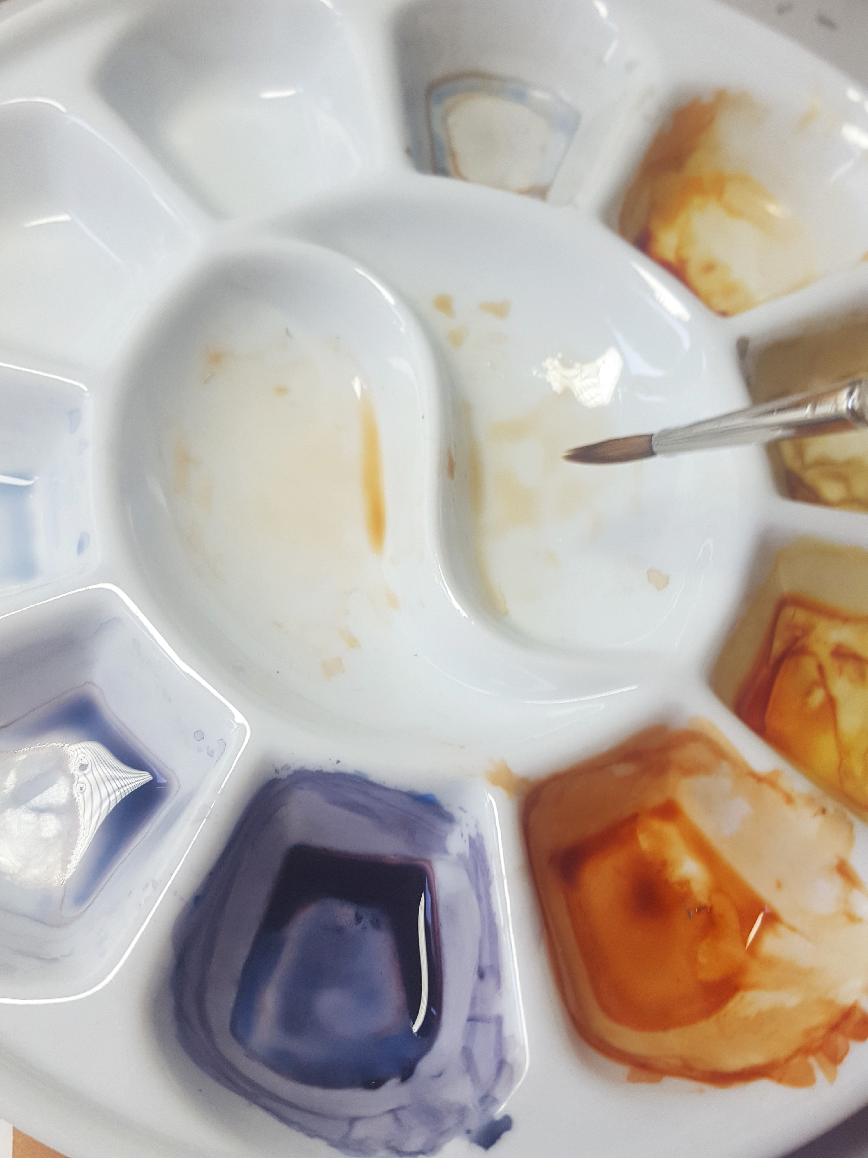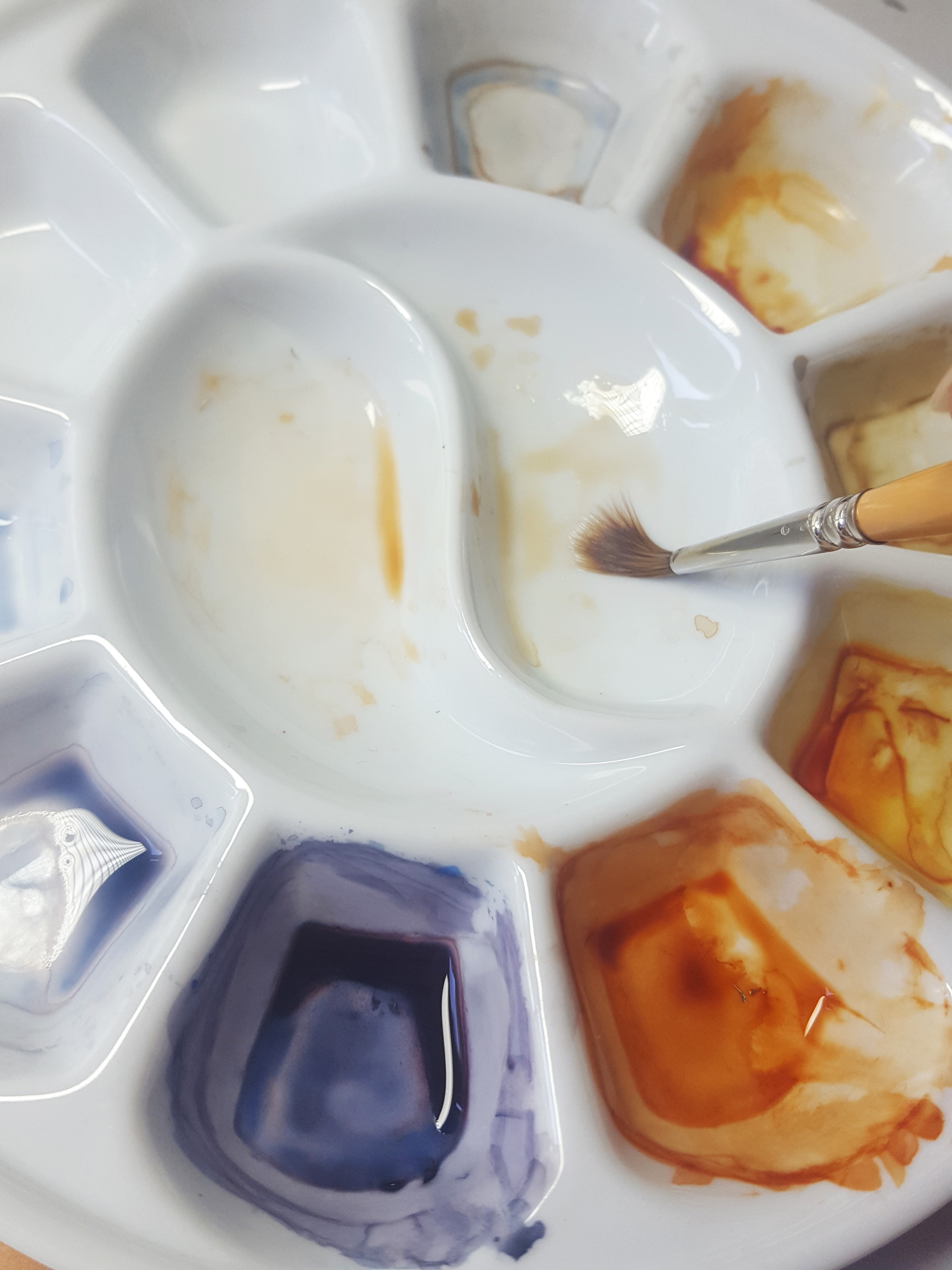 For the slate blue/grey I used W&N Ultramarine Green Shade (U(GS), Transparent Yellow (TY) and Permanent Rose (PR). Mix it like you’re making black (70% blue, 20% red and 10% yellow) but add in a little bit more of the blue. For the Tan colour I used Burnt Sienna (BS), Quinacridone Gold (QG), a tiny little Indanthrene Blue (IB) and a tiny bit of Sennelier Rose Madder Lake (SRML) – this could be replaced with W&N Permanent Rose, PR. I used a little SRML to just add a little brightness to the mix. For the second tan colour which is paler and more orange, I used QG and BS, more of the QG. I also mixed up a black using IB, TY and PR.